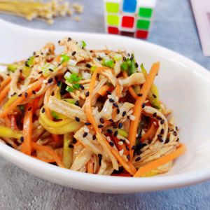 黄瓜丝,胡萝卜丝,鸡丝,撒上葱花,倒入料汁,搅拌均匀