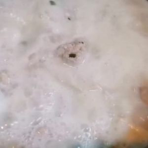 加入开水。我加了电水壶大半壶。加小葱节和姜片。大火熬十五到二十分钟。颜色就白了。