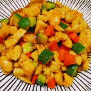 放入鸡胸丁和灵魂酱汁,炒熟,大火收个汁