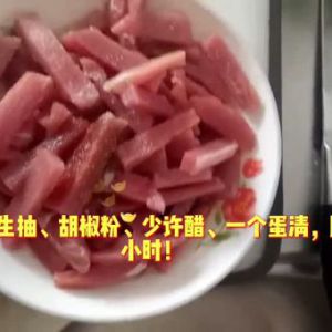 里脊肉切长条!放料酒、生抽、少许醋、盐、鸡蛋清,腌制半小时!