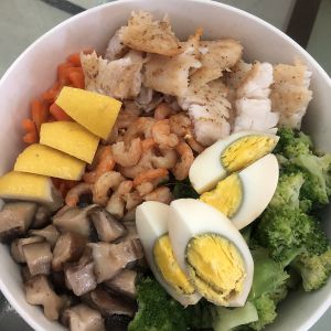 把意大利面放入大碗底部,依次有序地放入配菜。一种配菜放一个角落,虾放中间。