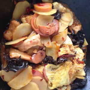 少许油,加入葱姜蒜、花椒大料、豆瓣酱,倒入煮好的蔬菜鱼丸,大火翻炒,加少许盐、味精……
