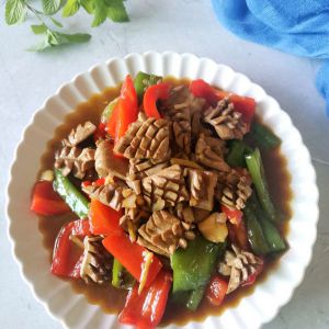 锅里烧热油,放入腰花段爆炒,炒两分钟后放入青红椒翻炒。