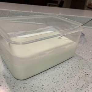 将要用到的盛具和勺子用开水烫过后,在面包机里放入1L常温全脂纯牛奶和1小包菌粉,搅拌均匀,调至酸奶模式,发酵8-12小时。发酵时间越长越酸,我们家比较喜欢吃不太酸的,所以一般发酵8小时。