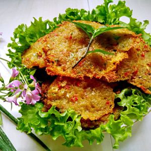 平底锅内放入适量的色拉油,待油烧至七成热时,用勺子舀起一勺拌好配料的土豆沬,放入锅中摊平,使其成为一个饼状,每锅可同时煎5一6个小饼为宜。
