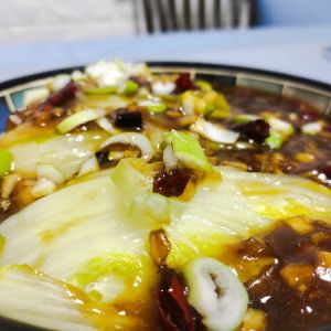 锅内倒入油烧热,放入蒜和干辣椒爆锅,出香气后倒入调好的酱汁,顺时针搅拌,汁稠后出锅,淋在娃娃菜上,撒入葱花即可。