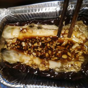 切开茄子淋入酱汁,继续放入烤箱烤制十分钟