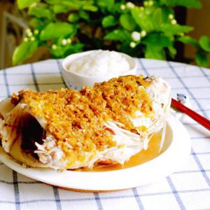 把切好的葱丝和姜片平铺在盘底,将腌制好的鱼头放入盘中,把黄剁椒酱均匀地铺在鱼头上。如果喜欢吃辣就多铺一点,吃不了太辣的少铺一点。