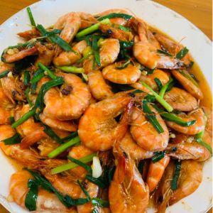 留底油下多一点花椒爆香,下姜蒜爆香,下虾翻炒,翻炒几下下耗油生抽,最后下韭菜小葱节。