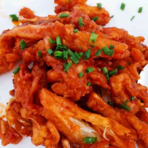 茄子去皮,切条,用盐水洗过捞起,挤一下水,再加大量生粉搅拌均匀,尽量让每一条都均匀沾到生粉,要干爽些哦,太粘稠就会全部粘在一起
