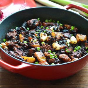 将大蒜和梅干菜入锅中,翻拌均匀,敞盖炖5分钟,关火,撒香葱末,端桌开吃喽!