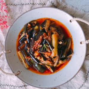 锅中热油加入茄子炸至微黄,大概90秒左右捞出备用