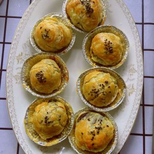 烤箱提前预热8分钟,放入做好的蛋黄酥,180度烤30分钟。