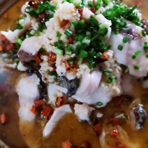 锅里留鱼汤开小火(注意不能大火,鱼片容易过老),保持微开状态下鱼片,八成熟捞出放鱼骨上面。