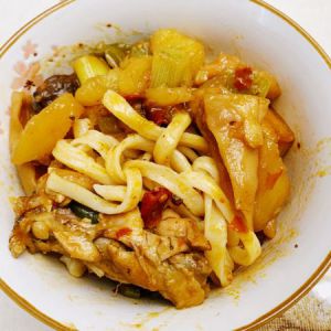 拉条子捞起盛碗,根据喜好拌上调料味,浇上软糯土豆大盘鸡,香喷喷好吃到停不下来!