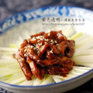 调匀酱汁后,放入滑过油的肉丝翻炒均匀后成出码放在葱丝上面。
