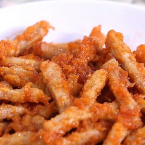 锅中放稍多点油,好糊的肉条炸至表面金黄色捞出。