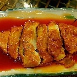 油的用量比较大,否则鱼容易炸散架。然后再用蕃茄酱和白醋、糖带少量的盐、勾芡汁,浇在炸好的鱼身上。