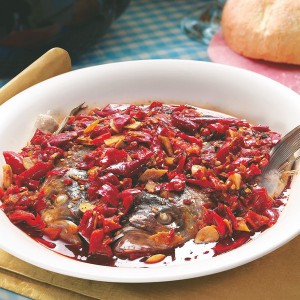 盘里码好葱段、姜片,放鱼头,撒姜丝,小米椒末,撒上红油拌剁椒
