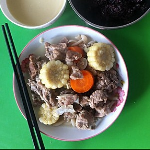 把排骨用清水洗去血水 放在热水里过两边 然后烧热油 把姜炒出香味 然后放入排骨 炒至两面发黄 然后放入水大火熬20分钟 转入小火 放入玉米 胡萝卜再熬20分钟 快好时加入盐 小蘑菇 再熬5分钟即可