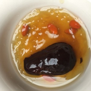 泡好的燕窝拿镊子挑出燕子毛,放进炖盅里,同时放冰糖(按个人口味喜欢甜的就多放),枸杞和红枣(红枣切一半营养才会充分释放)