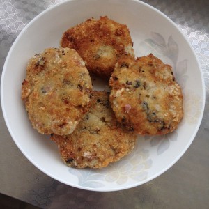 然后将土豆泥和鸡肉等均匀搅拌。用手取适量做成饼,沾取蛋液后在蘸上淀粉后复沾上蛋液滚上面包糠,下油锅炸至金黄即可。