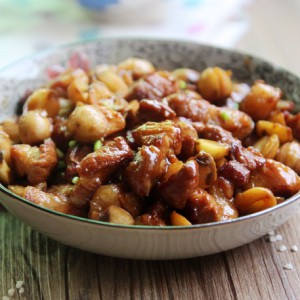 下五花肉块,翻炒,让每一块五花肉沾满糖浆,表面成琥珀色。