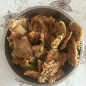 取出部分油,放入香菜,葱蒜,料酒,糖,白醋调至自己喜欢的味道即可,并放入炸好的肉爆炒,待香汁都挂上即可出锅。