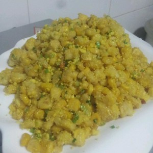 炸好的玉米 倒入炒香的蛋黄里倒入香菜末 葱末 装盘即可