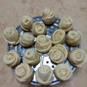 这就是做好的玫瑰花,水开后放蒸架上,蒸十五分钟,大功告成。