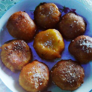 ⑥待饼有些泡起的时候就可以捞出了,将其放入碟中,如果感觉不够甜,可以再撒一点糖在上面(但要从锅中捞出来就撒上糖,不然糖会粘不上的)