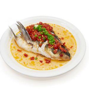 将蒸好后的鱼头取出,倒去碗内多余的汤汁,撒上葱花,淋入蒸鱼豉油,然后将适量的植物油烧热(表面有少量白烟冒出),泼在上面即可。