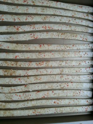 将条状面片排入烤盘,烤箱中层上下火220度15分钟即可。