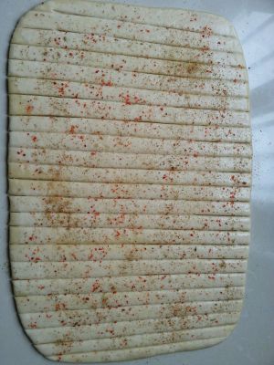 在切好的面片上刷一点水,然后洒上辣椒粉和孜然粉。洒多少可依自己的口味而定。预热烤箱220度10分钟。