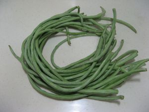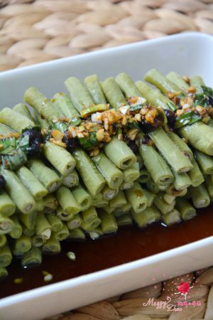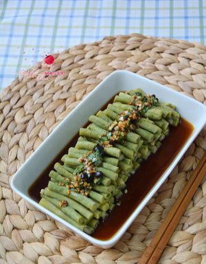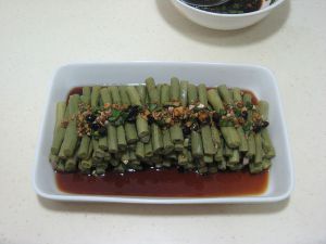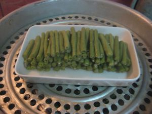 豇豆蒸熟后,从蒸锅中取出,晾凉