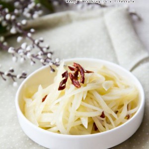 将白醋、盐、糖、蒜片、鸡精放在土豆丝上。锅内注入少许油,7成热时将油泼在所述食材上,搅拌均匀即可