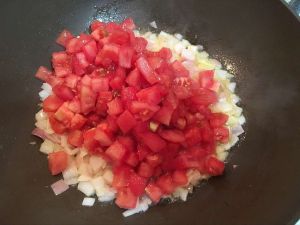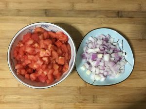 500克番茄放开水里烫一下去皮后切成小块,洋葱切丁。