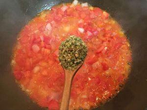翻炒至番茄出汤汁的时候加入一勺牛至叶和一勺罗勒。这里使用的牛至叶和罗勒都是干香料哦!加入香料后盖上盖子小火焖15分钟,在焖的过程中要打开盖子翻炒几次以免糊底