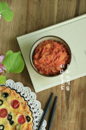 然后加入盐和少许糖调味。在大火翻炒几分钟收一下番茄的汤汁。炒至干干的状态即可。因为做比萨酱,水分不能过多。这款酱也可以用来做意大利面的酱哦!炒好的酱密封冷场保存,可以保存3-5天。