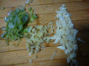 葱 、姜 、蒜切末备用,茼蒿洗干净切段