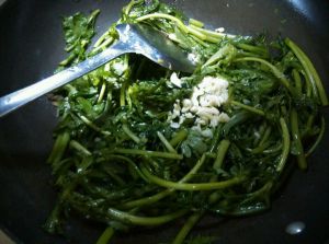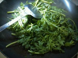 锅底留油,倒入葱姜爆香,放入洗干净的茼蒿煸炒