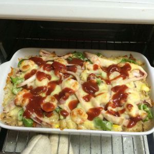 把炒好的饭装盘,稍微压实点点,把留出来的材料铺上去,最后放上披萨芝士,烤箱提前预热2分钟150,烤15分钟。