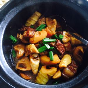 放入制作好的红烧肉中,用砂锅慢炖,加入适量味精,葱