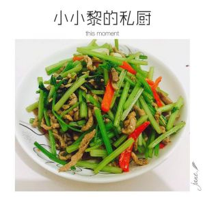 锅洗净擦干后再放入少许油,烧热,下姜丝爆香,再倒入芹菜翻炒,加入花椒粉和盐调味(盐和花椒粉一定要在倒入肉丝前放,因为肉丝在腌制的时候已经放过这两种调味料了,尤其是盐,如果放入肉丝后再放盐,会导致肉丝太咸而芹菜还没有入盐味),待芹菜炒至八成熟时,倒入刚才炒好的肉丝一起翻炒至熟。