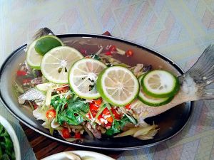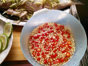 拍3-4个蒜头,切成蒜蓉,将小米椒切成小圈圈,挤出新鲜的柠檬汁,将蒜蓉,小米椒,鱼露和糖调在一起,搅匀。重要的事情要多说,让糖全部融在柠檬汁里面。这个调汁很重要,味道要鲜,要甜,后味感觉到辣。
