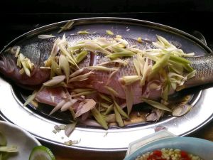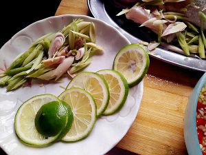腌鱼了。把鲈鱼洗干净,用刀在两面划三刀。在鱼身上抹些盐,滴点鱼露,吧刚切好的香茅铺上去,还铺点姜丝。腌一下,有时间,就腌1-2个小时。