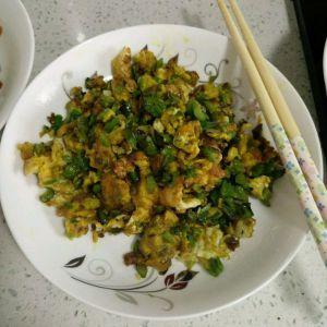 用锅铲把鸡蛋饼分成小块碎末,翻炒出锅