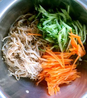 黄瓜和胡萝卜切成细丝备用