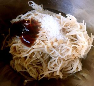 放入黄瓜丝和胡萝卜丝最后放入味精拌匀即可
