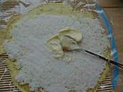7.倒入米饭,铺匀,边缘留1/4空隙。倒入一勺沙拉酱,涂抹均匀。
